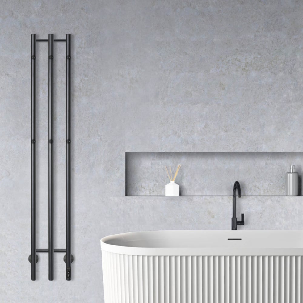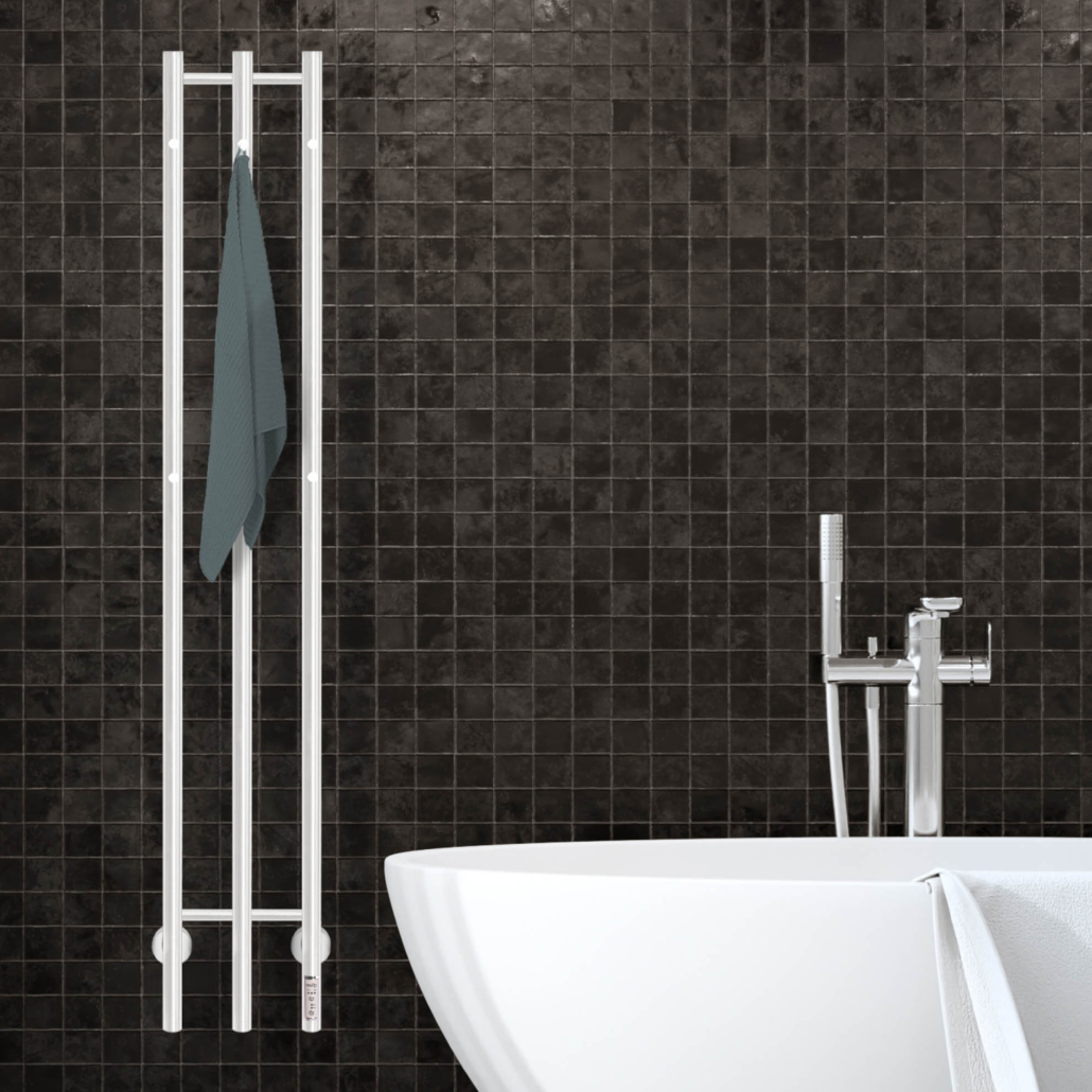 The Hudevad H3 Power is a beutiful and simple electric heated towel rail with 3 vertical tubes - each fitted with 2 hook that ensures that your towels in your bathroom can dry with ease. The H3 Power would also be obvious to use in the utility room for dampt coats, in the kitchen for wet tea towels and naturallay in the bathroom for towels and wash cloths. The heated towel rail can be installed wherever it is possible to connect it to 220-240V power and is installed with either a hidden cable directly in the wall or with a visible cable and plug. Hudevad H3 Power is equipped with a control panel on the front, where you can choose between 3 heat settings and whether it should heat for 3 or 6 hours or heat continuously until you turn it off.